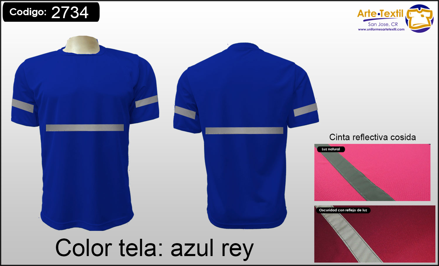 Producto código: 2734 Camiseta Dry Fit Cool Plus azul rey con 2 cinta reflectivas de tela cosidas Reflomax Industrial gris horizontal de 1 pulgada cosidas, masculino, manga corta - EN INVENTARIO |