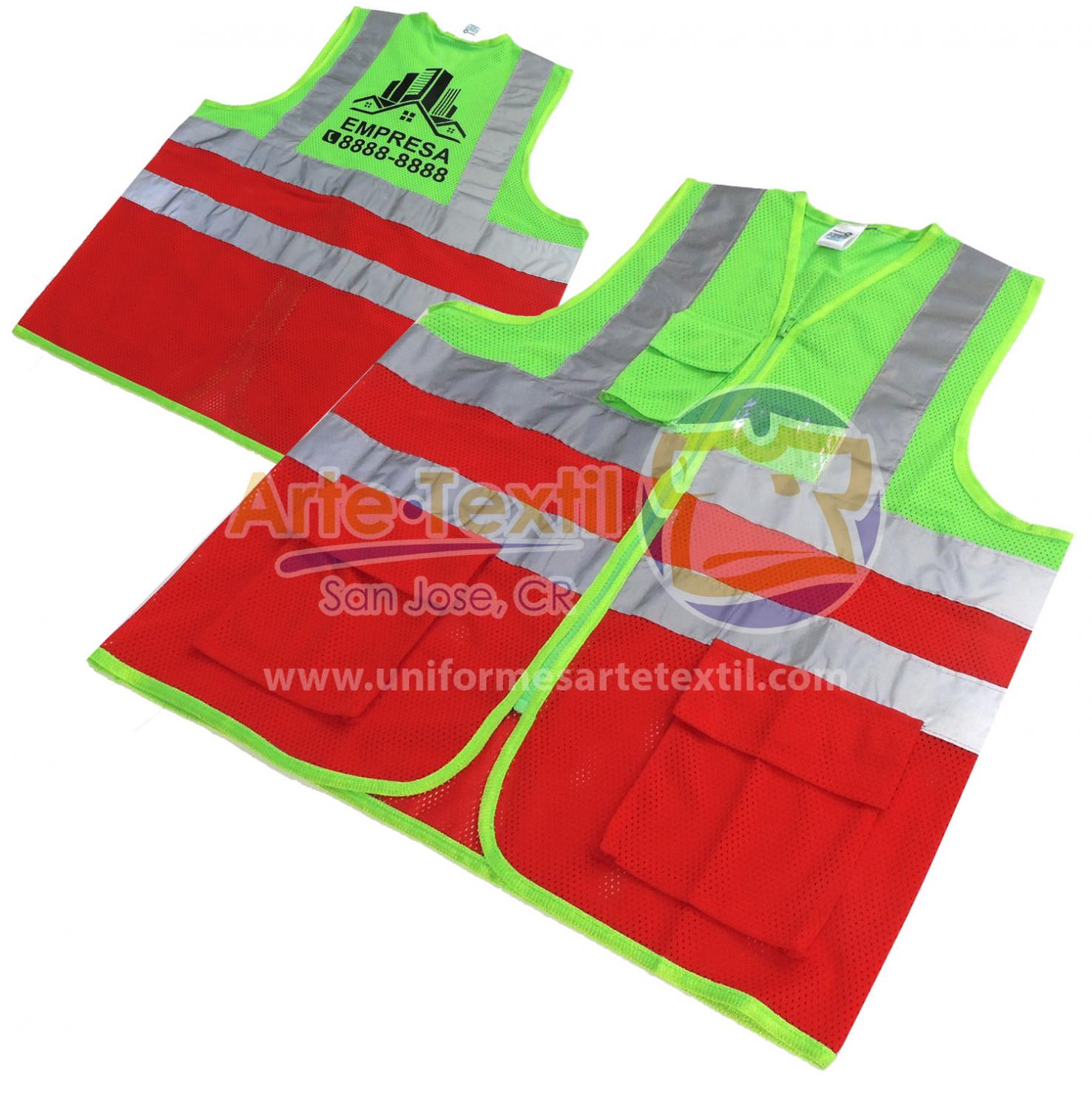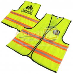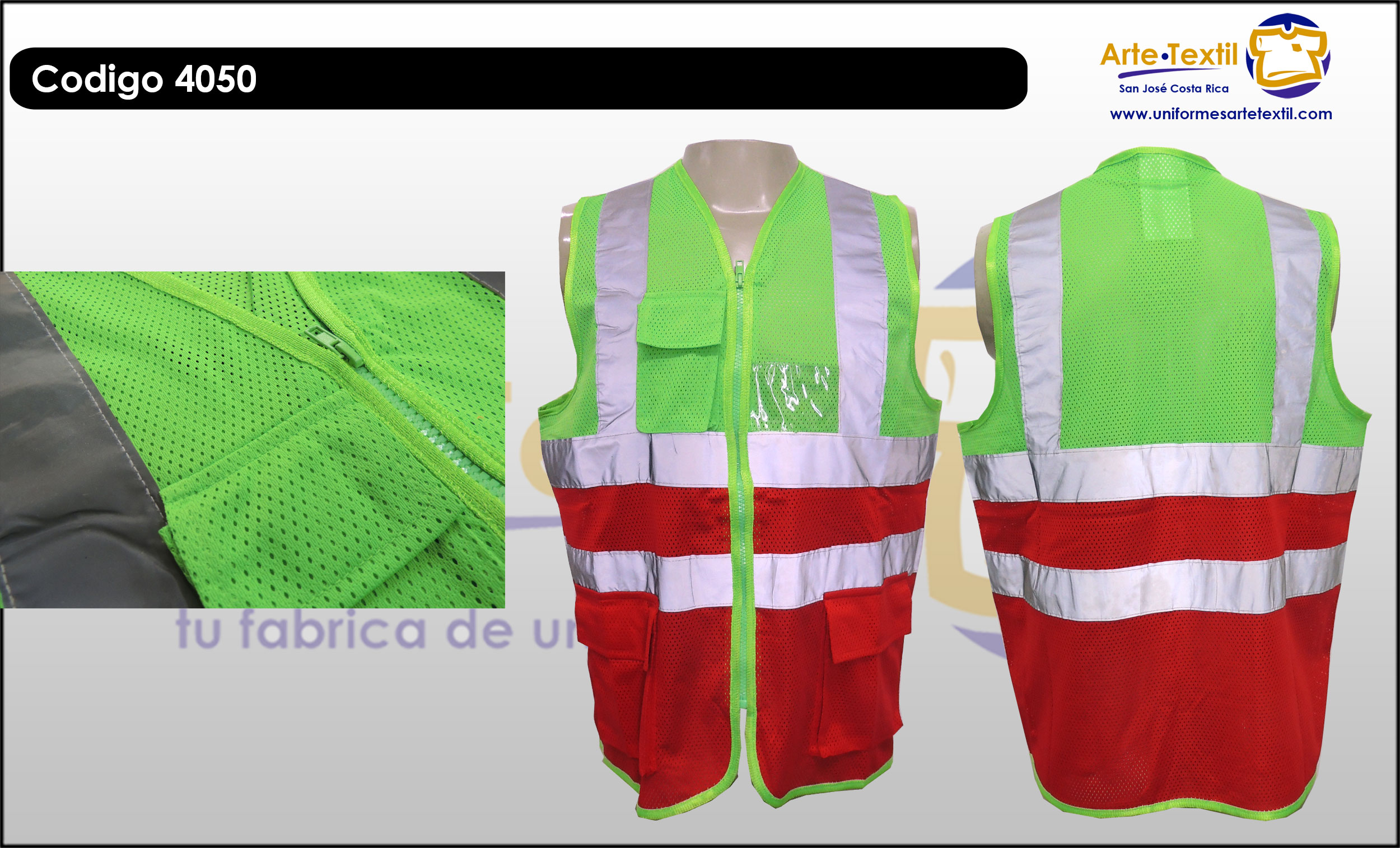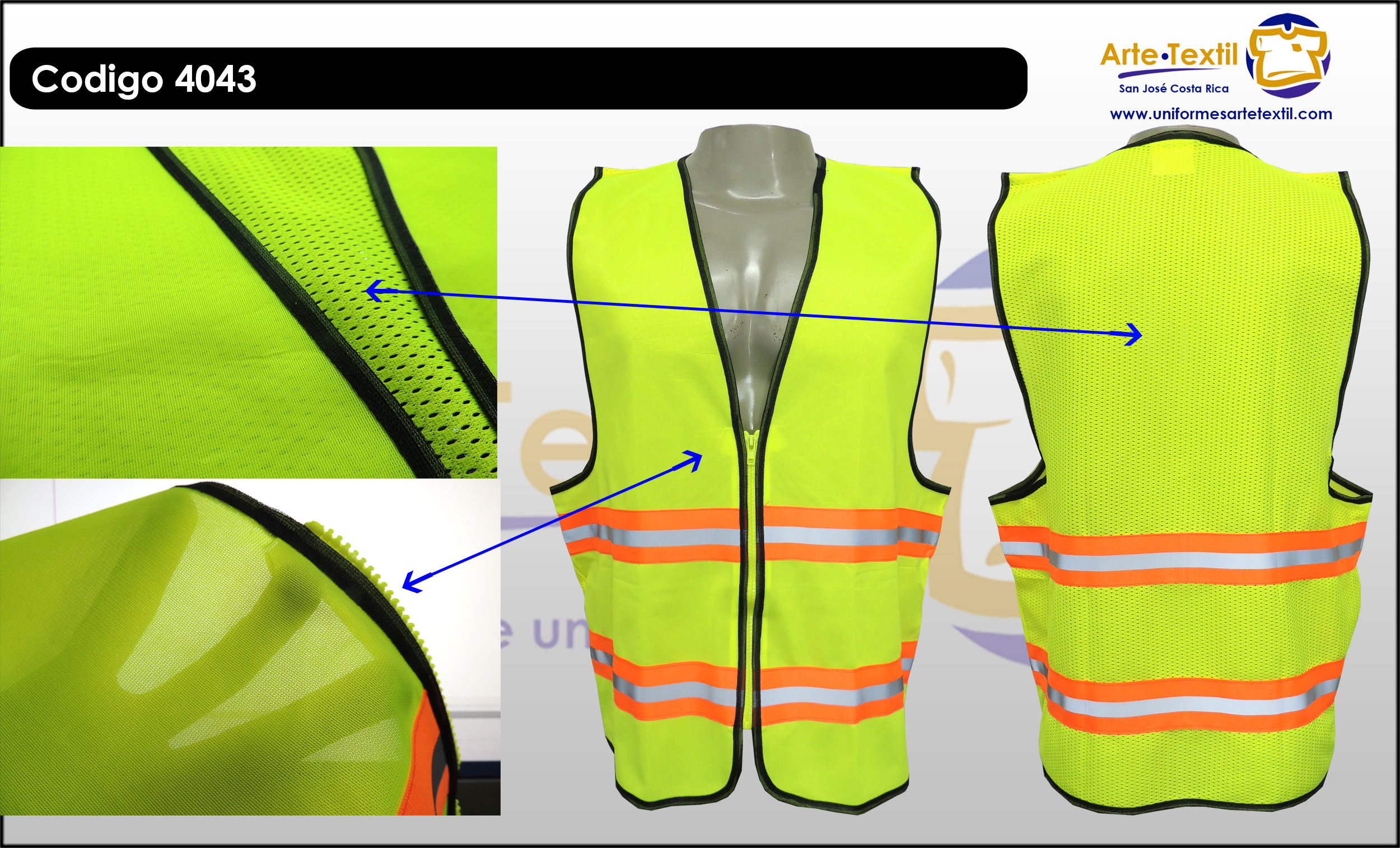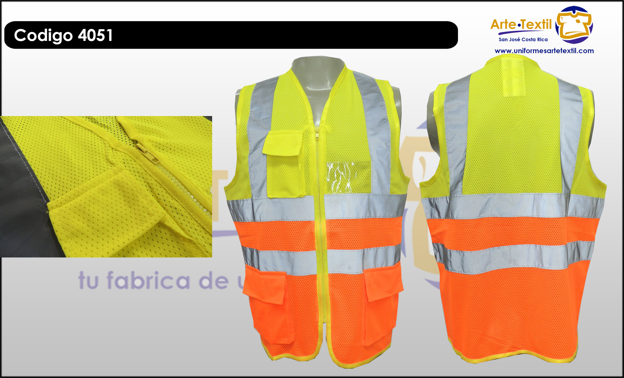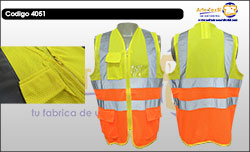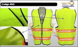 Producto código: 4043 Chaleco reflectivo calidad económica importado, amarillo neón con 4 cintas reflectivas naranja neón con plateado de 2 pulgadas, tela Dry Fit calada, cierre con zipper, Talla L (única) - en inventario |
