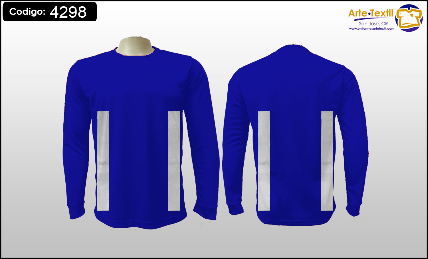 Producto código: 4298 Camiseta, tela Dry Fit Cool Plus color Azul Rey, con 4 cintas reflectivas gris Industrial de vinil textil estampadas en el torso tamaño medio verticales de 2 pulgadas, sin cintas en las mangas, masculino, manga larga, EN INVENTARIO