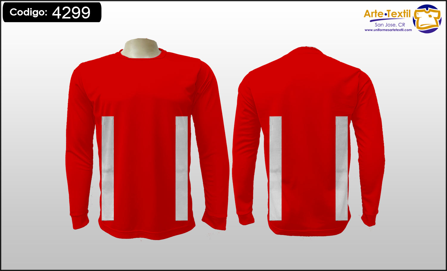 Producto código: 4299 Camiseta, tela Dry Fit Cool Plus color Rojo, con 4 cintas reflectivas gris Industrial de vinil textil estampadas en el torso tamaño medio verticales de 2 pulgadas, sin cintas en las mangas, masculino, manga larga, EN INVENTARIO