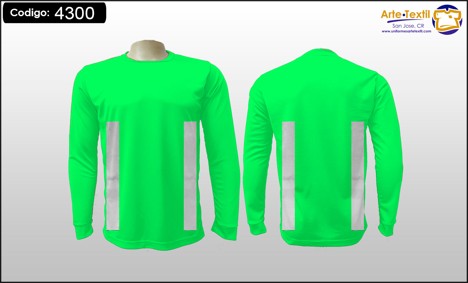 Producto código: 4300 Camiseta, tela Dry Fit Cool Plus color Verde Neón, con 4 cintas reflectivas gris Industrial de vinil textil estampadas en el torso tamaño medio verticales de 2 pulgadas, sin cintas en las mangas, masculino, manga larga, EN INVENTARIO