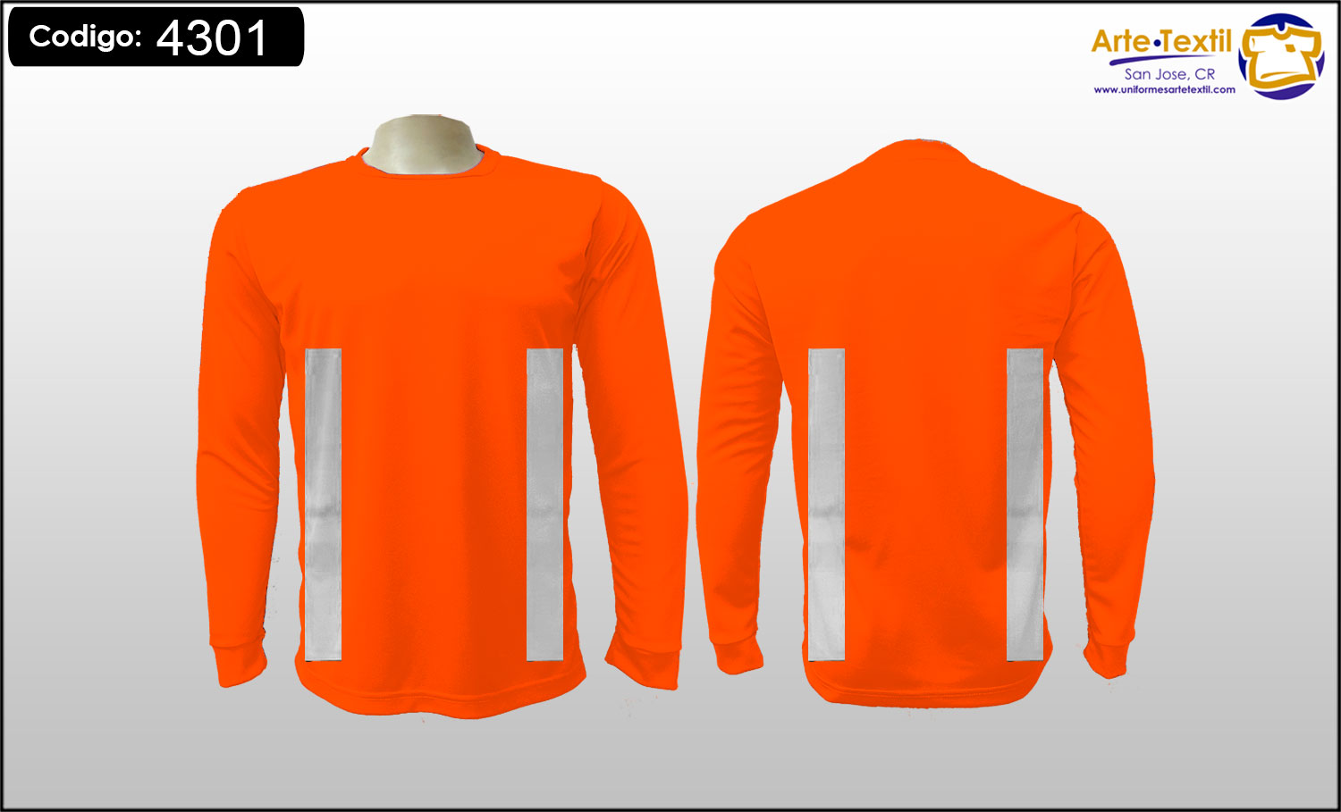 Producto código: 4301 Camiseta, tela Dry Fit Cool Plus color Naranja Neón, con 4 cintas reflectivas gris Industrial de vinil textil estampadas en el torso tamaño medio verticales de 2 pulgadas, sin cintas en las mangas, masculino, manga larga, EN INVENTARIO
