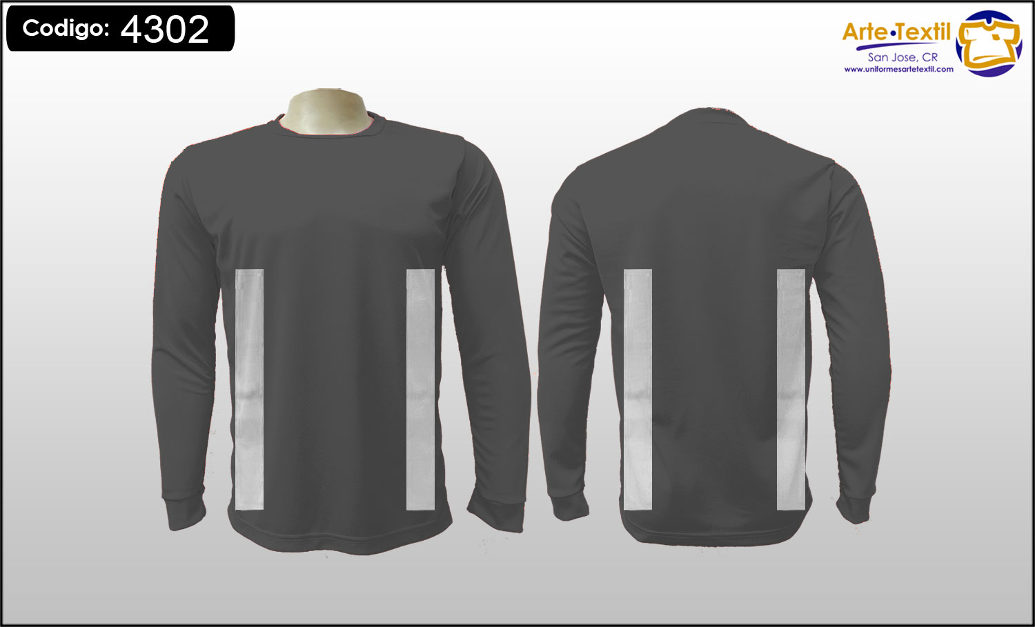 Producto código: 4302 Camiseta, tela Dry Fit Cool Plus color Gris Oscuro, con 4 cintas reflectivas gris Industrial de vinil textil estampadas en el torso tamaño medio verticales de 2 pulgadas, sin cintas en las mangas, masculino, manga larga, EN INVENTARIO