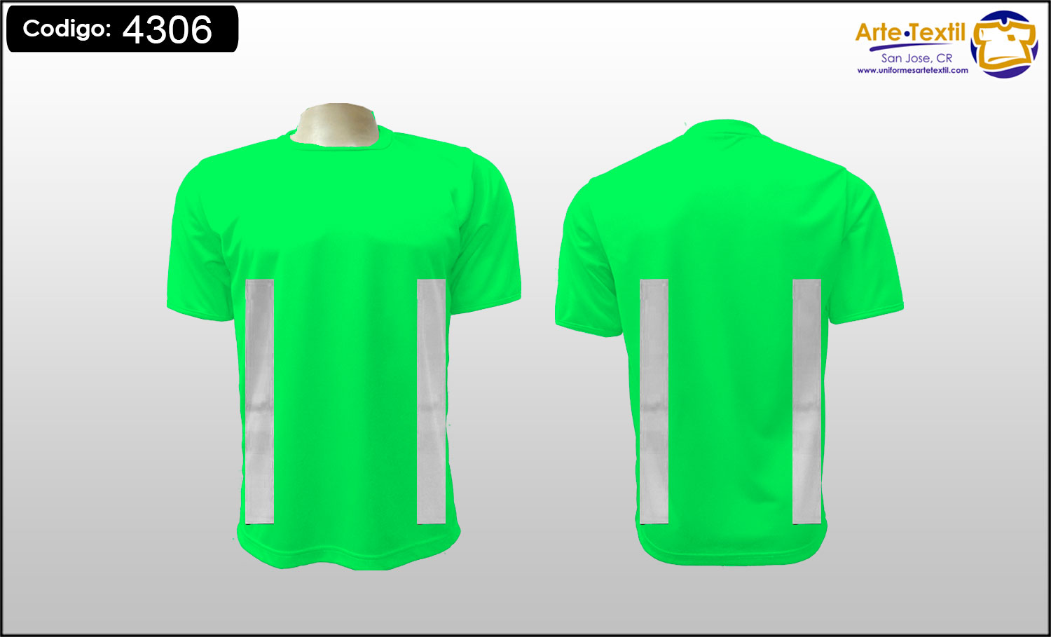 Producto código: 4306 Camiseta, tela Dry Fit Cool Plus color Verde Neón, con 4 cintas reflectivas gris Industrial de vinil textil estampadas en el torso tamaño medio verticales de 2 pulgadas, sin cintas en las mangas, masculino, manga corta - EN INVENTARIO